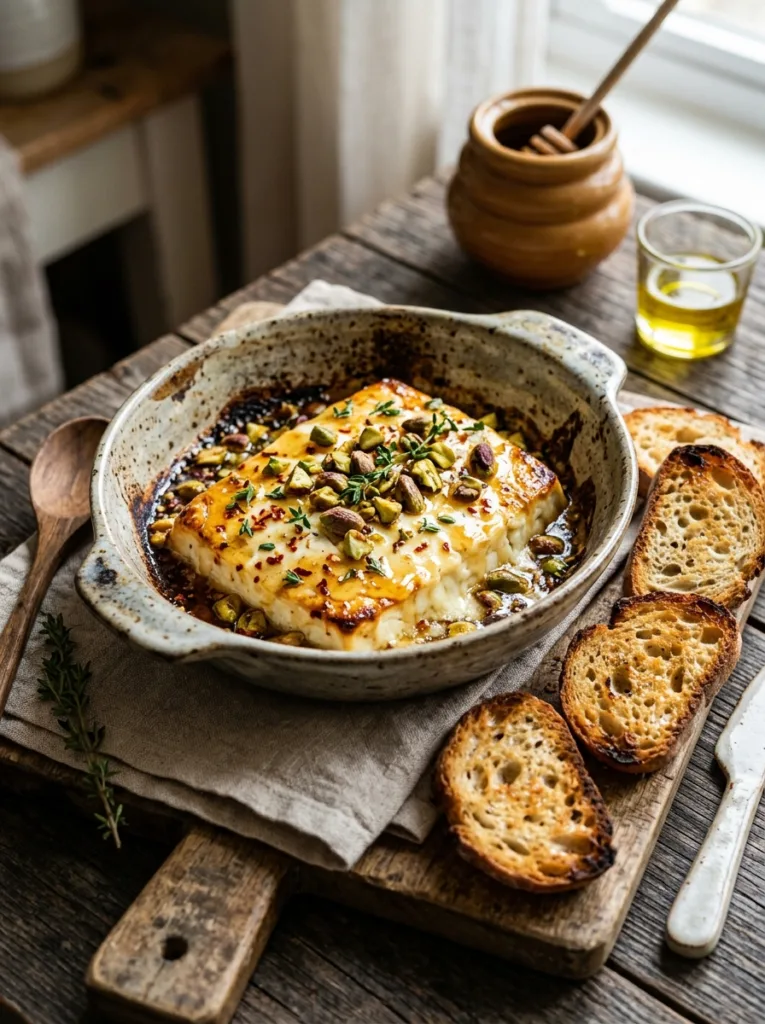 Baked Feta with Honey is a warm, creamy, and sweet-savory appetizer made with feta cheese, honey, olive oil, herbs, and crunchy nuts. It is perfect for parties, holidays, or a quick snack.