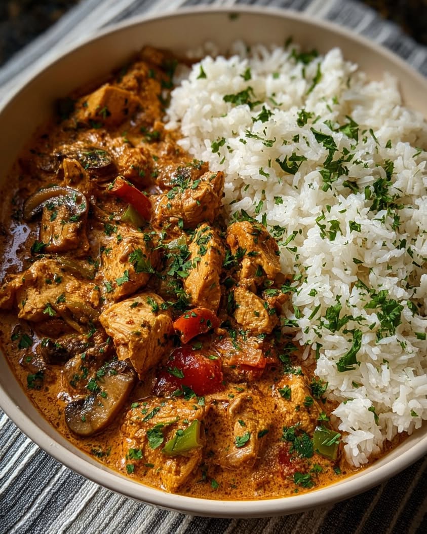 A rich and aromatic curry with tender chicken in a creamy coconut sauce, served over perfectly steamed fluffy rice.