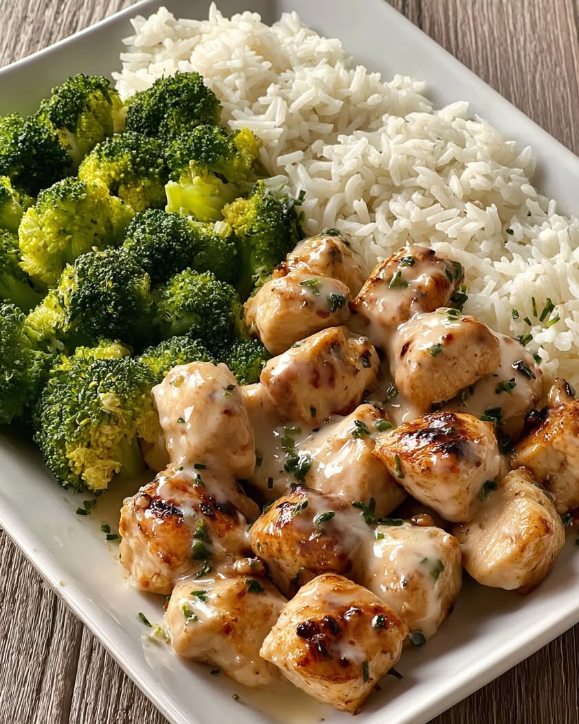 Creamy Garlic Chicken Bites with Fluffy Rice & Roasted Broccoli: A Quick, One-Pan Dinner That’s High-Protein and Family-Friendly