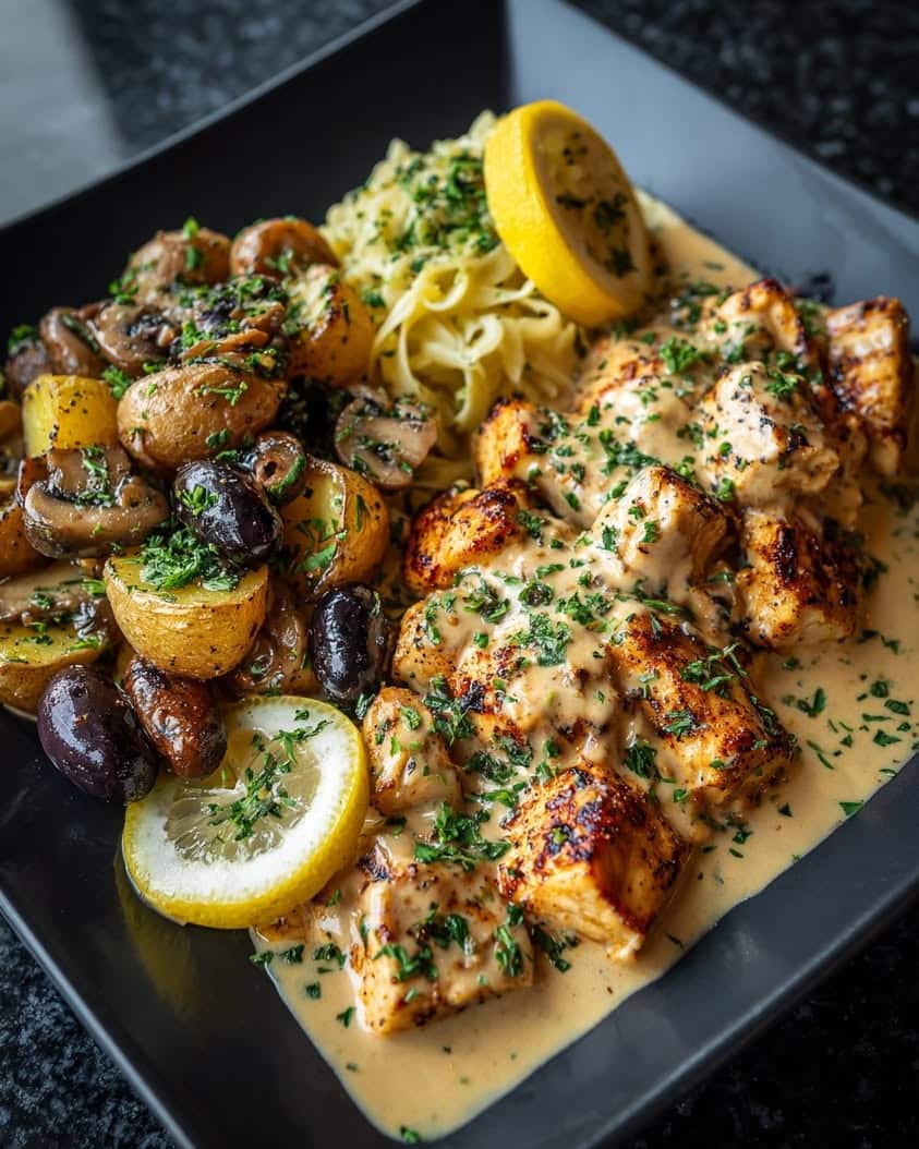The magic of this meal lies in its beautiful balance. For instance, the creamy sauce clings to the juicy grilled chicken bites, creating a luxurious mouthfeel that contrasts wonderfully with the crispy exterior of the herb-roasted potatoes. Meanwhile, the olive-mushroom medley adds a pop of umami and a slightly tangy note that cuts through the richness. Ultimately, every component complements the others, resulting in a cohesive and deeply satisfying plate that will have everyone asking for seconds.
