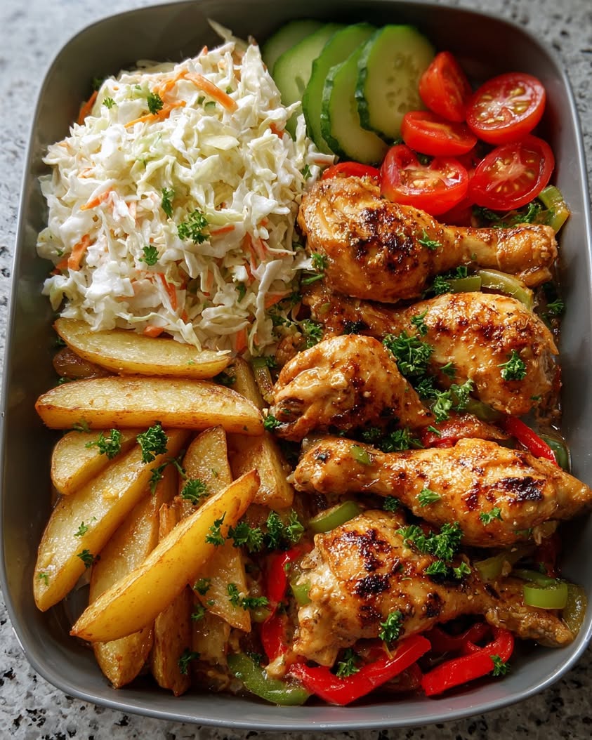 A hearty and flavorful meal featuring juicy herb-roasted chicken drumsticks, crispy potato wedges, tangy coleslaw, and fresh seasonal vegetables.