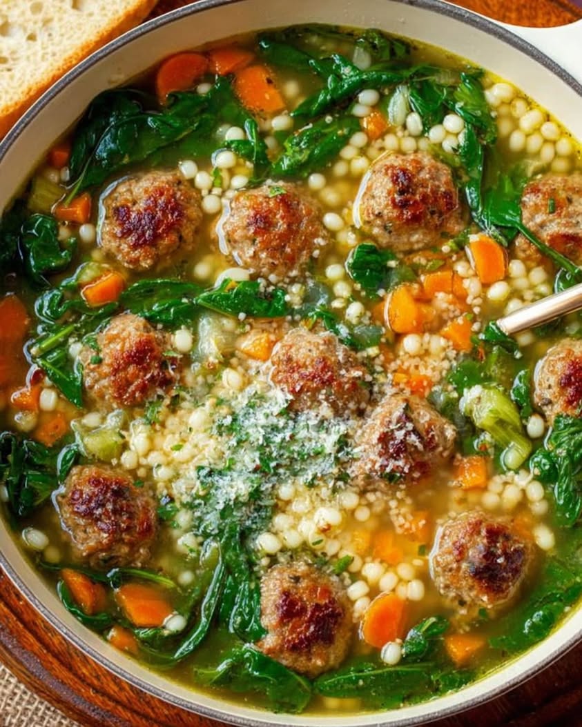 Savory Homemade Italian Wedding Soup: Tender Meatballs, Fresh Spinach, and Acini di Pepe Pasta in a Rich, Comforting Broth