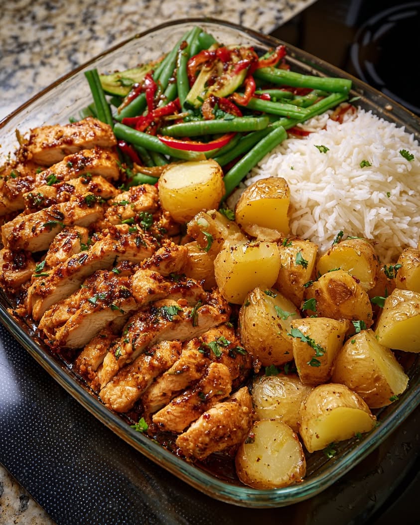 A complete, flavorful sheet-pan meal featuring tender chicken thighs glazed with a sweet and tangy honey-mustard sauce, served alongside crispy herbed potatoes, fluffy rice, and fresh green beans.