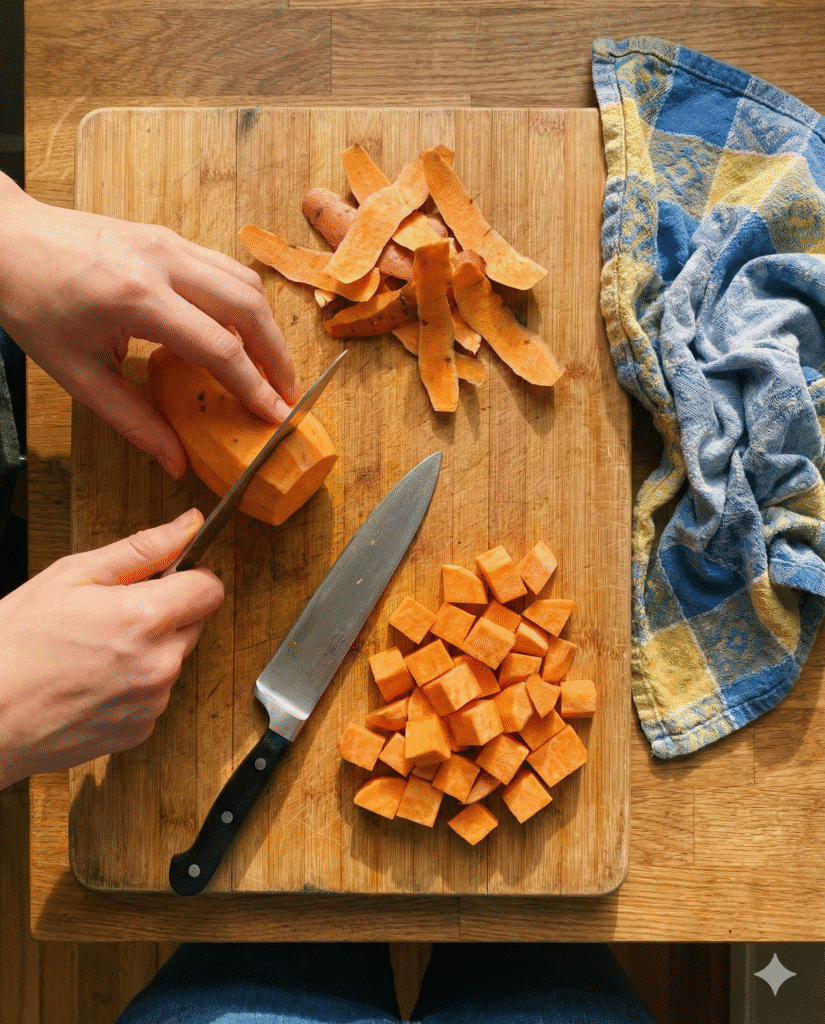 Start by washing and peeling your sweet potatoes if you prefer a silky texture. Next, cut them into evenly sized cubes so they cook at the same rate. Then place them in a large pot, cover with cold water, and bring everything to a gentle boil. Cook for about 15–20 minutes until they pierce easily with a fork.