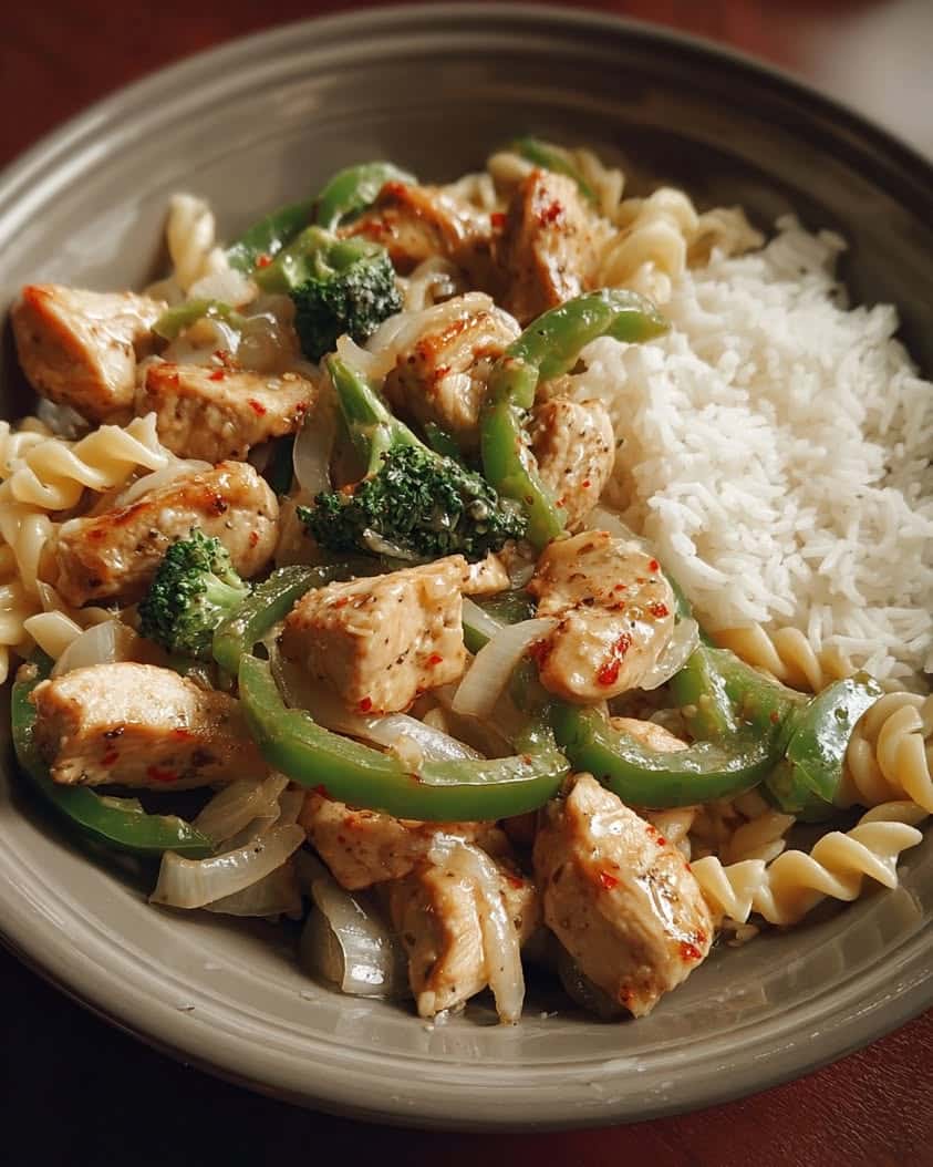 Culturally, dishes that combine starches like pasta and rice often appear in regions where grains are dietary staples. For instance, in some Middle Eastern and Mediterranean cuisines, rice and vermicelli are cooked together. This recipe borrows that harmonious starch concept and pairs it with a Western-style pan-fried chicken and vegetable sauté. The fusion creates a new, culturally-blended comfort food that speaks to today’s interconnected culinary world.