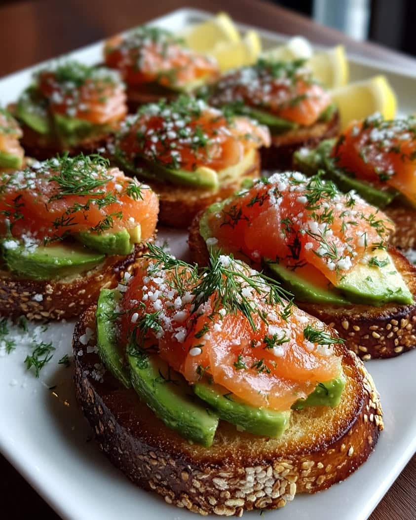 An elegant and easy appetizer featuring creamy avocado, smoked salmon, and fresh herbs on crispy toasted baguette slices.