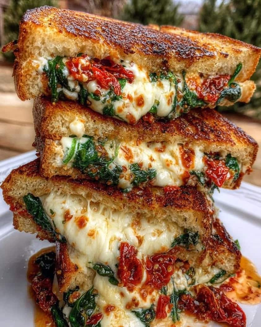 A gourmet twist on the classic grilled cheese, featuring creamy ricotta, tangy sun-dried tomatoes, and fresh spinach on golden, buttery bread.