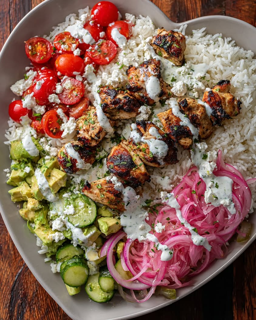 - Assemble bowls: divide cooked rice among four bowls, top with chicken, avocado slices, pickled onions, and a dollop of tzatziki.